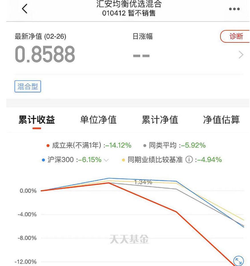 例如汇安均衡优选混合型基金是 2021 年 2 月 9 日成立的基金,建仓过于急躁,2 月 26 日的净值为 0.8588,9 个交易日下跌 14.12%,一个半月下跌 23%。新基金建仓期又无法卖出,你睡得着觉吗?