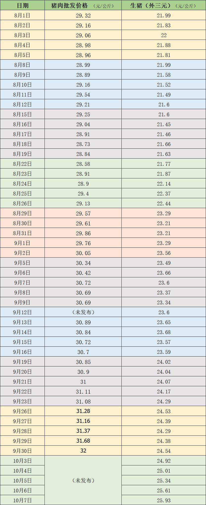 2022年10月8日消息:本周农业农村部的全国农产品批发市场猪肉平均价格尚未公布。从生猪价格来看,本周国内生猪价格呈连续上涨走势,全国均价每公斤上涨约1元。据中国养猪网的数据,10月7日,生猪(外三元)价格为25.93元/公斤,与上周五(9月30日)的24.54元/公斤相比,上涨5.7%。从周内来看,本周生猪均价为25.36元/公斤,与上周24.43元/公斤的均价相比,上涨3.8%。
