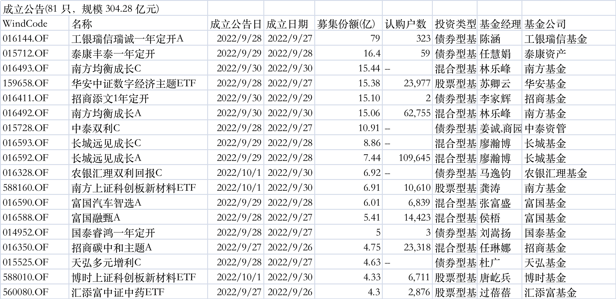 Wind数据显示,节前一周共81只基金发布成立公告,总规模达304.28亿元;共57只基金发布发行公告,36只基金首发,1只基金上市