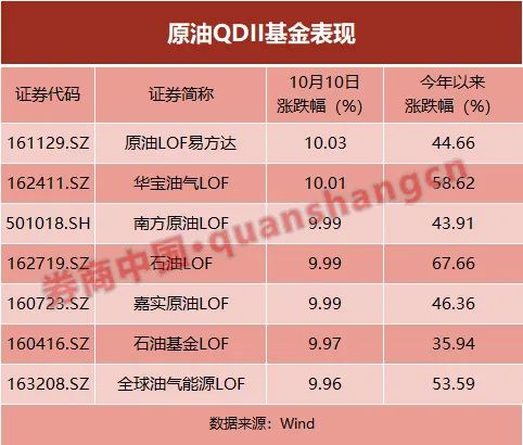 原油QDII基金也水涨船高,10月10日,7只原油QDII基金集体涨停。
