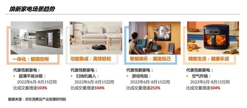 近日,京东家电联合GfK中怡康联合发布的《2022“新家电”市场焕新趋势报告》显示,新风空调、游戏电视、扫地机器人、空气炸锅、嵌入式洗碗机等品类均取得较高增长,正在成为带领行业实现可持续增长的先进驱动力。