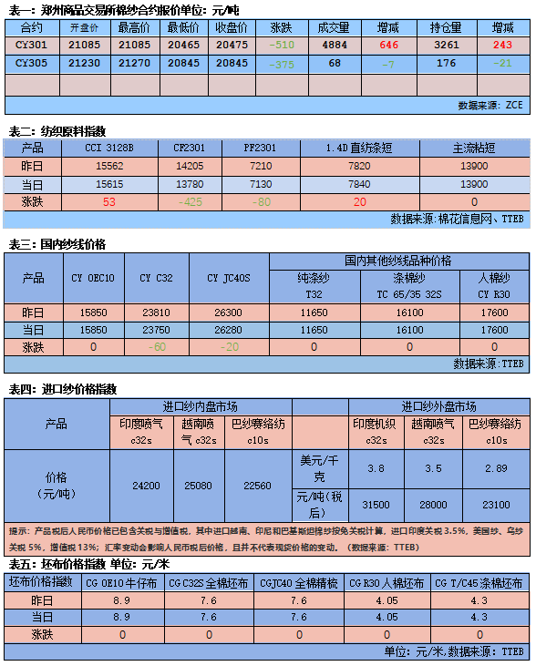 9月 23日,棉花现货指数 CCI 3128B报价至 15615元 /吨( +53); CY Index C32S报价 24620元 /吨( 0); FCY Index C32S(进口棉纱价格指数)报价 29822元 /吨( 0);部分地区棉纱价格:
