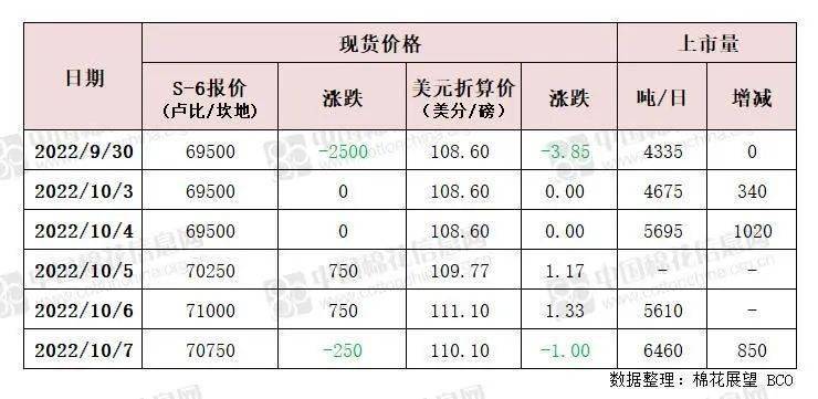 同期,印度S-6现货报价整体较节前下调至70000卢比/坎地一线上下,美金折价在110美分一线附近,至年度内低点。从新棉上市情况来看,目前印度新棉日上市量折皮棉在6500吨,较节前明显增加,详情如下。